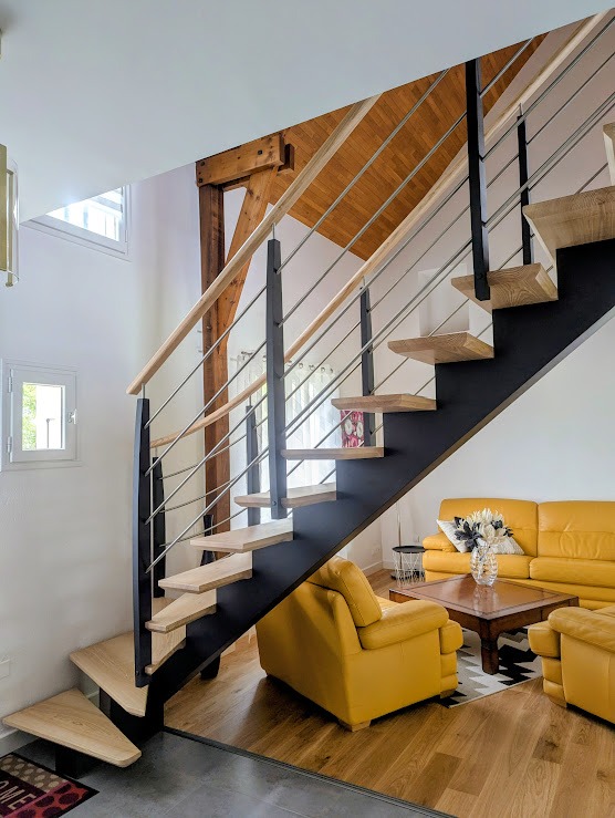 Ce type d’escalier donne l’impression que les marches flottent dans l’air, ce qui amplifie la sensation d’espace et de légèreté dans la pièce