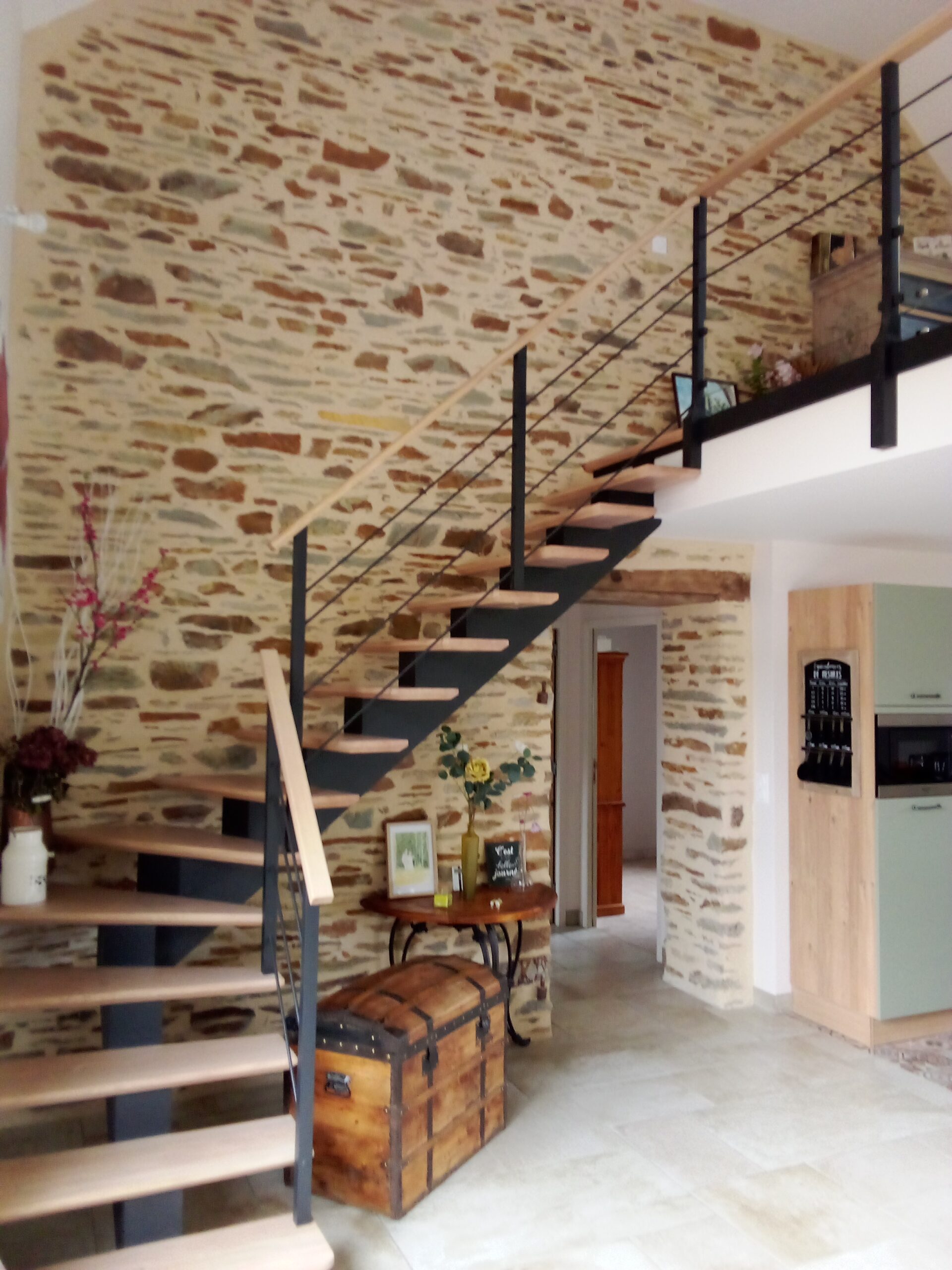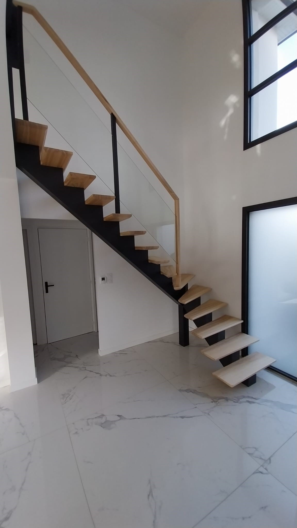 Le limon en forme de crémaillère, soutient les marches grâce a un portage central, créant un effet visuel distinctif et géométrique.