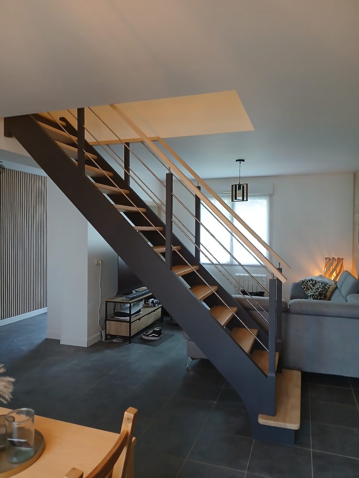 Son esthétique moderne et épurée en fait un choix idéal pour les intérieurs contemporains, avec une structure visible et élégante qui apporte une touche architecturale. Le limon crémaillère offre une légèreté visuelle.